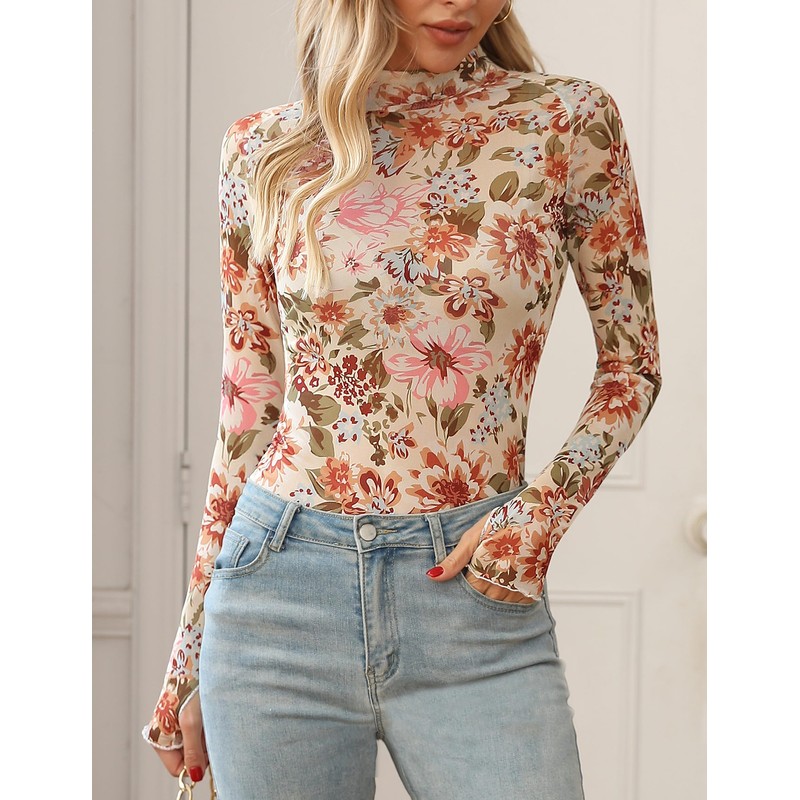 - Features: Long sleeve floral mesh top, mesh long sleeve top, mesh floral shirts is perfect as layering tops, the see through tops for women is designed with sheer tops looks, mock neck tops styles with thumbhole holes, and elaboration floral printing, creating cute, slim fitted and casual style, a great mesh shirt, sheer shirt, going out tops for women, girl and ladies