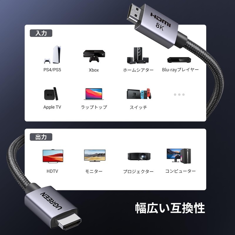 - 【HDMI 2.1 Certified】UGREEN 8K HDMI 2.1 cable supports various high video resolutions and refresh rates such as 8K@60Hz UHD video, 4K@240Hz, 120Hz, 2K, 1080P, 48bit/px HDR color depth, enchanted audio return channel (eARC). Enjoy high-resolution content even on large screens. Also compatible with DynamicHDR to optimize contrast and brightness per scene or frame