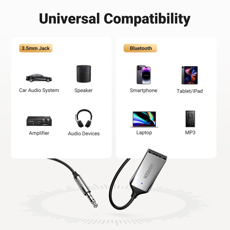 • 【デバイスを2台接続可能】:UGREEN Bluetoothレシーバーは、2台の機器と同時に接続することは可能です。音楽再生、電話などたくさんの機能をご利用いただけます。※レシーバーモードではスマホなどの機器を最大2台同時に接続可能ですが、複数の音源を1度に再生することはできません。