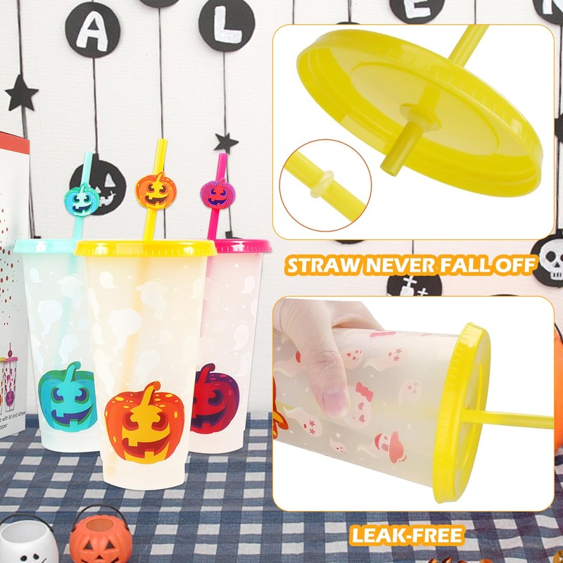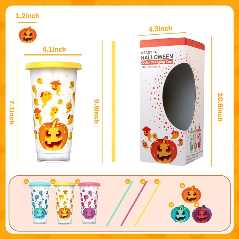 • 【Cold Color Changing Cups Set】Includes 3 reusable plastic tumblers (24floz / 710ml), each with vibrant Halloween-themed prints that change color when filled with cold beverages—perfect for iced coffee, smoothies, and festive drinks!