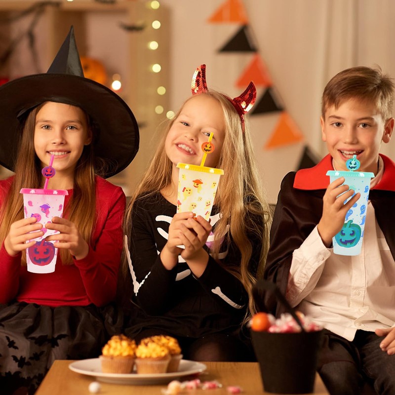 Each cup features a unique Halloween-themed design—complete with smiling jack-o'-lanterns, floating ghosts, and matching lids and straws. Perfect for Halloween parties, fall festivals, trick-or-treat gatherings, or sipping iced coffee, smoothies, soda, and juice on the go.