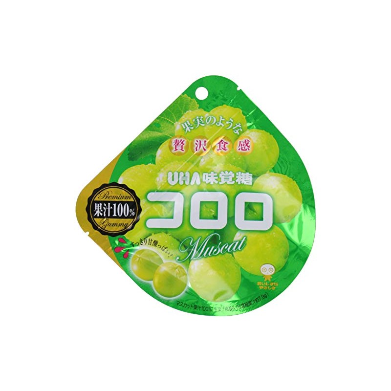 - 原材料:果糖ブドウ糖液糖、砂糖、濃縮果汁(マスカット、りんご)、水飴、コラーゲン、植物油脂/グリセリン、酸味料、ゲル化剤(増粘多糖類)、香料、クエン酸カリウム、着色料(ウコン、クチナシ)、セルロース、光沢剤、安定剤(CMC)、(一部に牛肉・りんご・ゼラチンを含む)