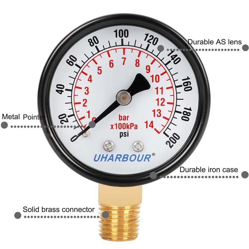 Uharbour Reliable Dual Scale Mechanical Pressure Gauge for Gas and Water (200psi/14bar) with 1/4" BSPT Bottom Mount…