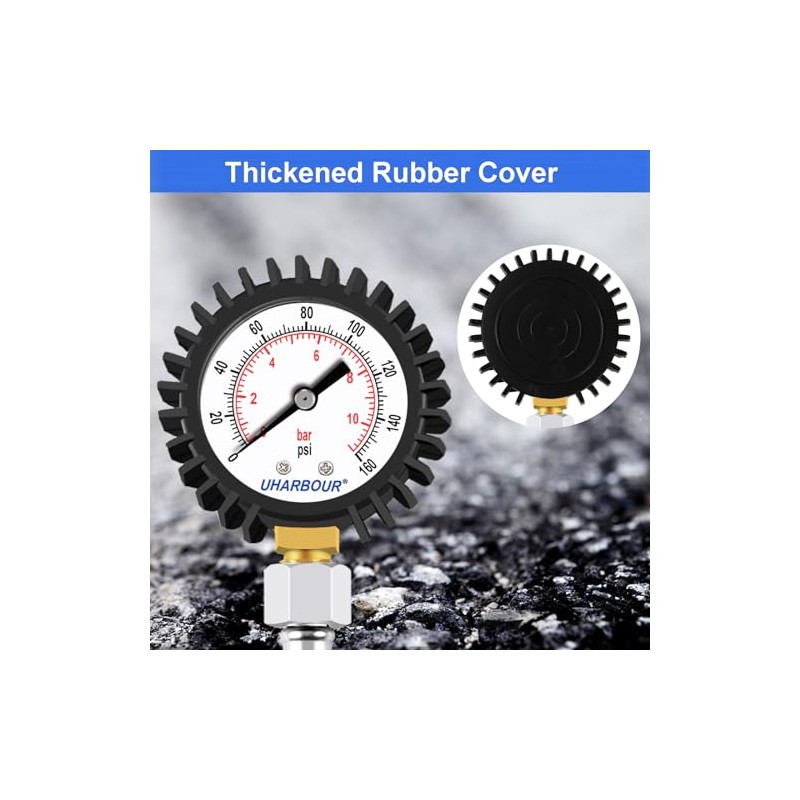 - Material: Stainless steel braid hose and corrosion-resistant pressure gauge, with rubber protector. Brass thread guarantees long trem use.