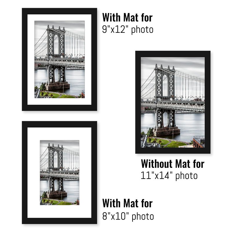 - 【SIZE】Outer dimensions: 12.2 X 15.2 Inch / 30.98 X 38.60cm,Inner dimension: 11 X 14 Inch / 27.94 X 35.56cm.This 11x14 Inch Frame with two piece of mats,Without Mat Display 10.5 X 13.5 Inch,With Mats Display 9 X 12 Inch or 8 X 10 Inch.The actual mat opening was designed slightly smaller than photo itself in order to hold it steadily while not a defect.