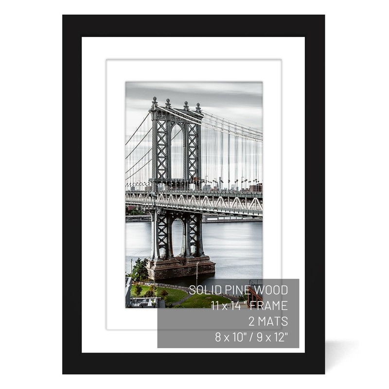 UHFWIFR 11x14 Picture Frames Solid Wood Display Pictures 9x12 or 8x10 with Mat or 11x14 Frame without Mat Poster Photo Frame Art with 2 Mats for Wall Mounting or Table Top(Black)