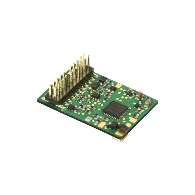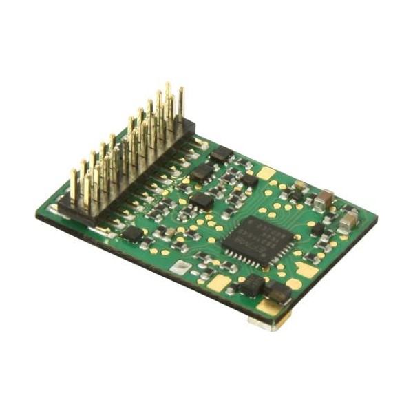 The ID2 decoder PluX22 + Mfx is equipped with seven special function outputs. The outputs can be switched cyclically or switched on for a limited time. Features: data formats DCC and Motorola II. With seven special function outputs - Direction-dependent switching of outputs (e.g. for control cars) - Outputs can be switched on for a limited time (e.g. for electrical clutches) - Outputs can be switched on cyclically (flashing generator e.g. for Swiss tail light, programmable motor characteristic curve) programmable via CV (DCC). and by Motorola DigitalcentRal, load capacity up to 1.2 A, each output up to 0.2 A. Size: 22.00 x 15.00 x 3.80 mm PluX 22 connection