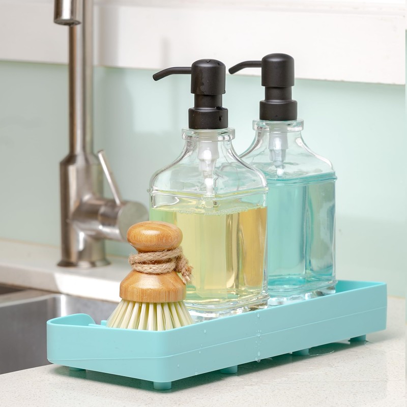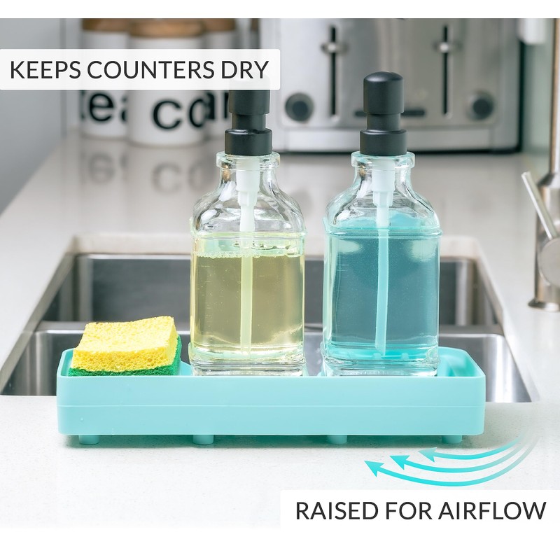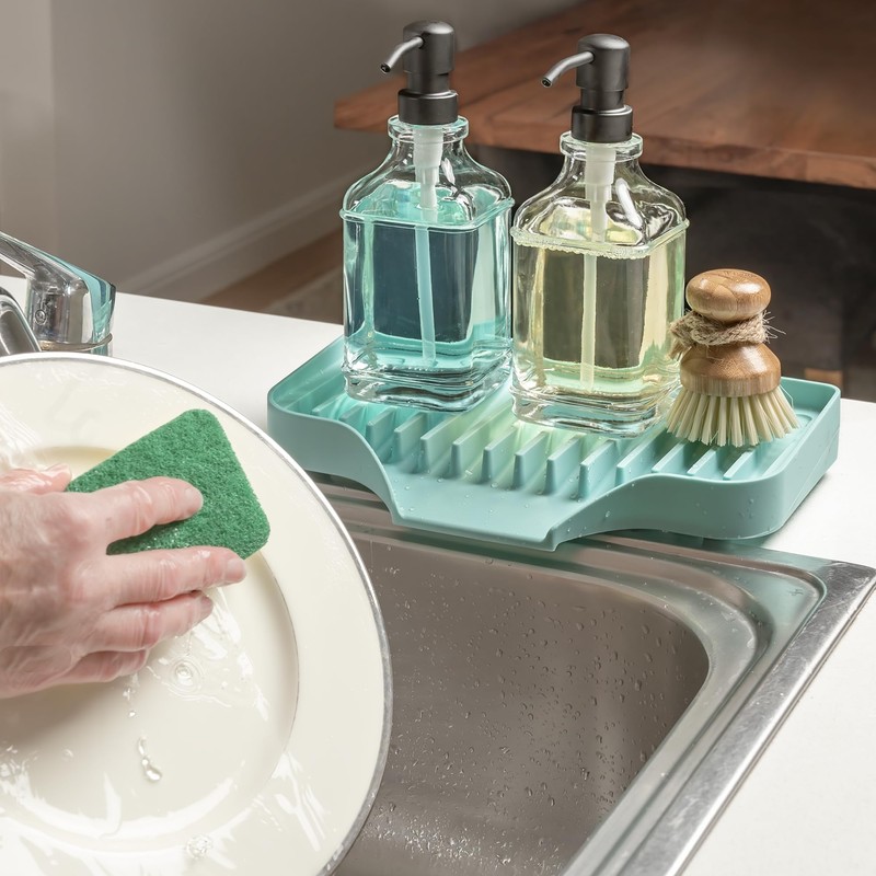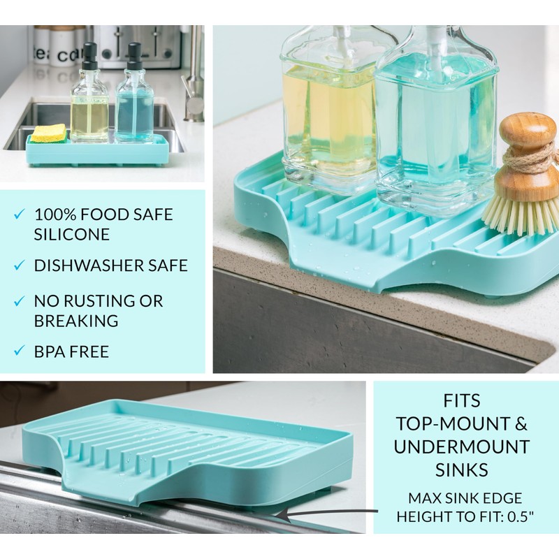 - Keeps Your Sink Area Clean- This silicone sink draining mat catches all drips. Great silicone sink organizer for kitchens faucets. Silicone soap tray with drain that holds multiple soap dispensers and large size sponges at the same time