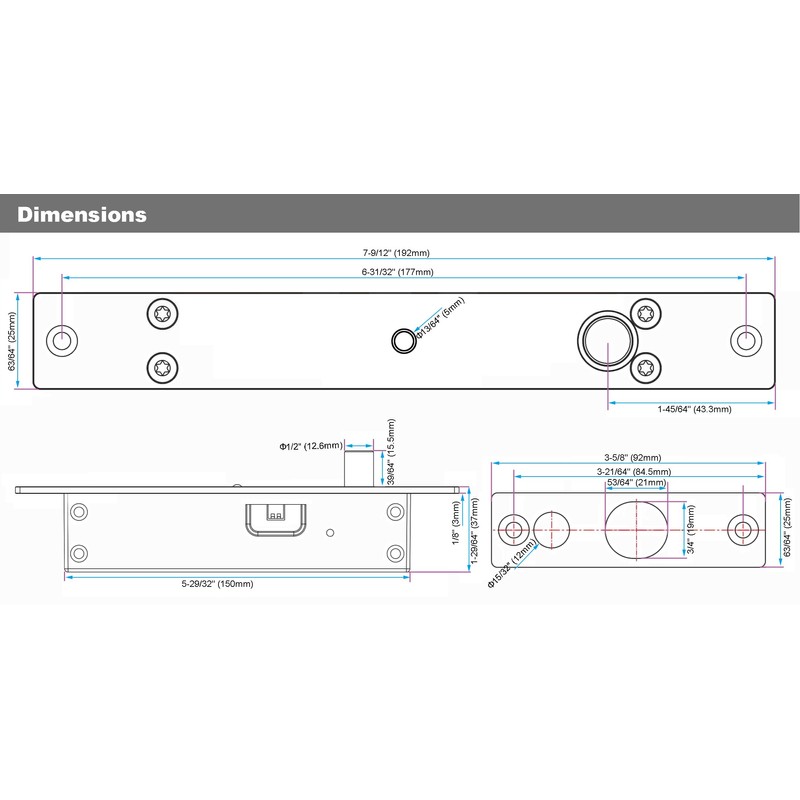 **Specifications:** Lock bolt: The diameter og 12.5mm stainless core,extending the length of 15mm Main body: 7.9(L)x1.5(W)x1.1(H) inch / 200(L)x38(W)x28(H)mm Net weight: 740g / 1.63lb Voltage: DC12VStandby Current: 01.4A Start Current: 1.1ASignal Output: Door status Output,NC/COM Solid Bolt : Polishing housing, 1000Kg Holding Force Time: 0/3/6 second