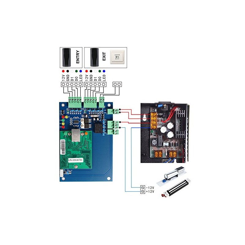 Dimension: - approx.160 (W) x 106 (H) mm / 6.3 (W) x 4.17 (H) inch Communication: TCP/IP Software Supportable Database: Access & SQL Power Supply Input: DC 12V, 4~7A Power Consumption of Circuit Board: Less than 100mA Input Format of Reader: Wiegand 26-40 bit (All 125KHz or 13.56MHz card reader with compatible protocol) Quantity of Readers: 4 units Door Controlled: 2 door (Get in and out door by swiping card, or get in by swiping card and get out door by button) Door Opening Time Extending: Setting: 1~600 seconds (adjustable) Max Quantity of Controller: Unlimited (Remark: N denotes q ' ty of computer serial prot or q ' ty of 485hub port, support 256pcs ports) Quantity of Users: 20,000 users Quantity of Event Buffers (offline): 100,000 event buffers Max Distance from Reader to Controller: 100m (suggestion distance 80m) Alarm for Long Time Door Open, Unlawful Entry, Intimidate Fire and alarm linkage: If no connection with the expansion board, only has software interface alarm, and drive the computer speaker. If connected with expansion board, is able to alarm by hardware, if connected with strengthened expansion board, then is able to Security alarm Complsive open and close door at long time: Yes Open door in remote distance: Yes Inter block: Yes Anti pass back and tail: Yes Multi-card open door: Yes Open long time at specified time: Yes Electronic map: Yes Urgency locking: Yes First card unlocking: Yes Unlock based on internal and external validation: Yes Keypad (Card+passwor, supper password): Yes