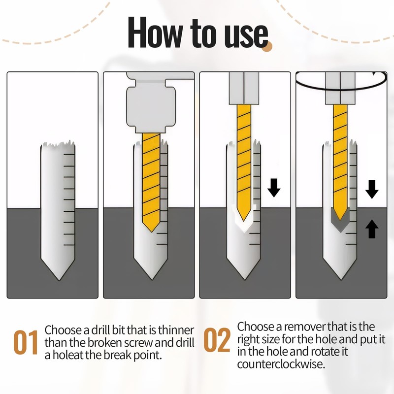 Extract stuck screws within 10 seconds by first using the appropriate size drill bit to bore a hole in the screw head, then effortlessly reverse the remover counterclockwise into the damaged screw until it's released.