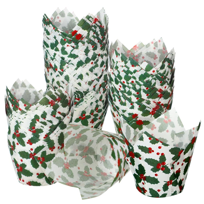 Uiifan 200 Pcs Holly Christmas Tulip Cupcake Liners Christmas Cupcake Wrapper...