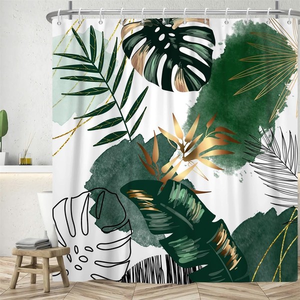 Uiiooazy Shower Curtain, Boho Style, Shower Curtain, Green Gold Palm Leaves, Tropical Shower Curtains, Anti Mould, Waterproof Polyester Fabric, Washable Bathroom Curtain with 12 Hooks for Bathroom,