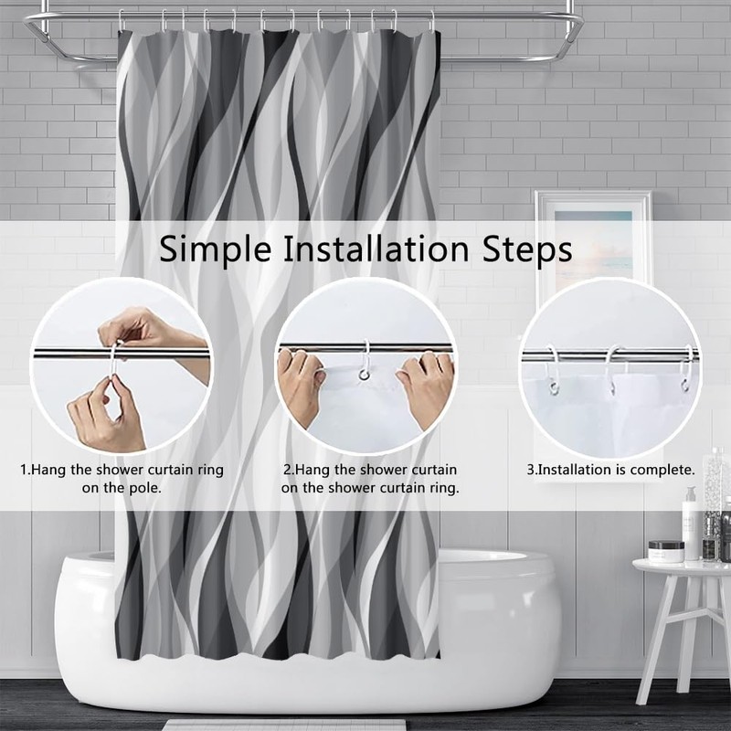 - Easy installation: shower curtains geometric pattern easily fit into any standard size shower/tub and work with straight or curved shower rods. C-shaped hooks made of ABS and rust-proof metal eyelets can help you open and close the shower curtain smoothly.