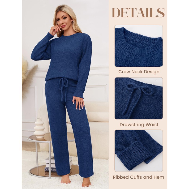 - 【Unique Comfy Loungewear】Uikue women's Casual Pajama Set features a loose fit with crew neck and long sleeve designed. Fuzzy pajama pants with drawstring waistband so you can adjust them to fit. Pj sets for woman fabric is made of special knitted fabric, soft fabrication feels as smooth and light as air on your skin.