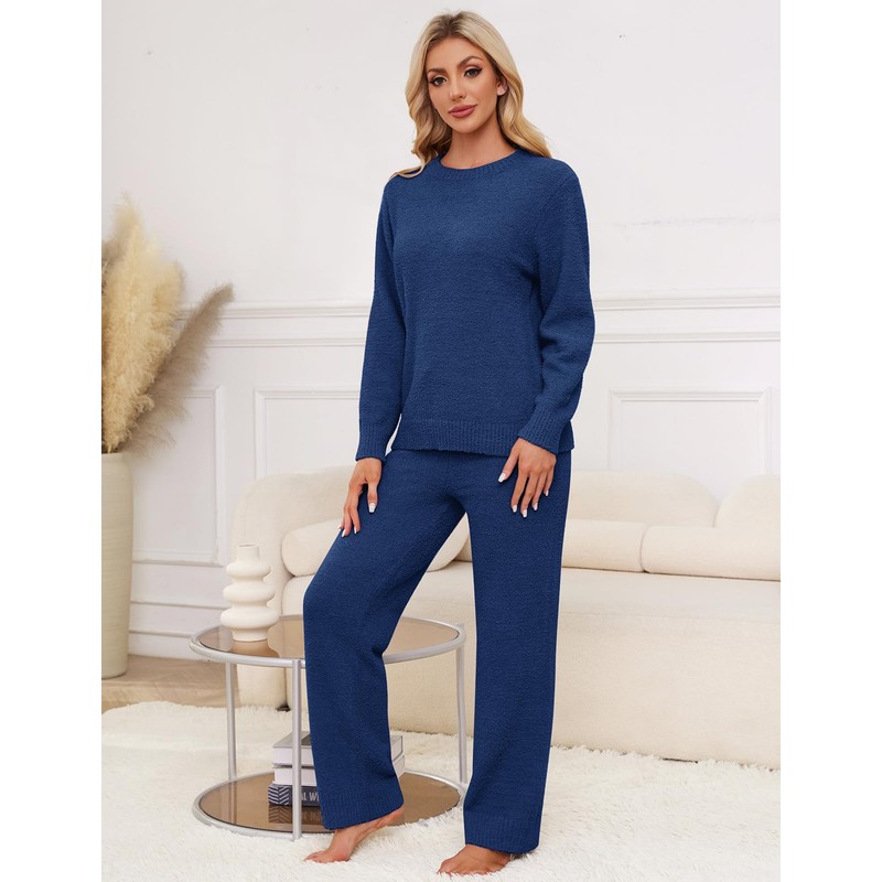 Uikue Fleece Pajama Set for Women Fuzzy Lounge Sets Winter Knitted Pj Loungewear Sleepwear 2 Piece Soft Sweater Pants Outfits(Navy,XL)