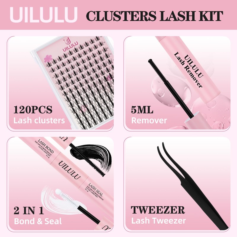 - Full Lash Clusters Kit - Package comes with a full set of DIY lash extension kit with 120 count 10-16mm mixed clusters lashes, lash clusters glue bond and seal, lash remover, and lash applicator. Convenient full set lash kit for beginners, perfect at home lash extension kit