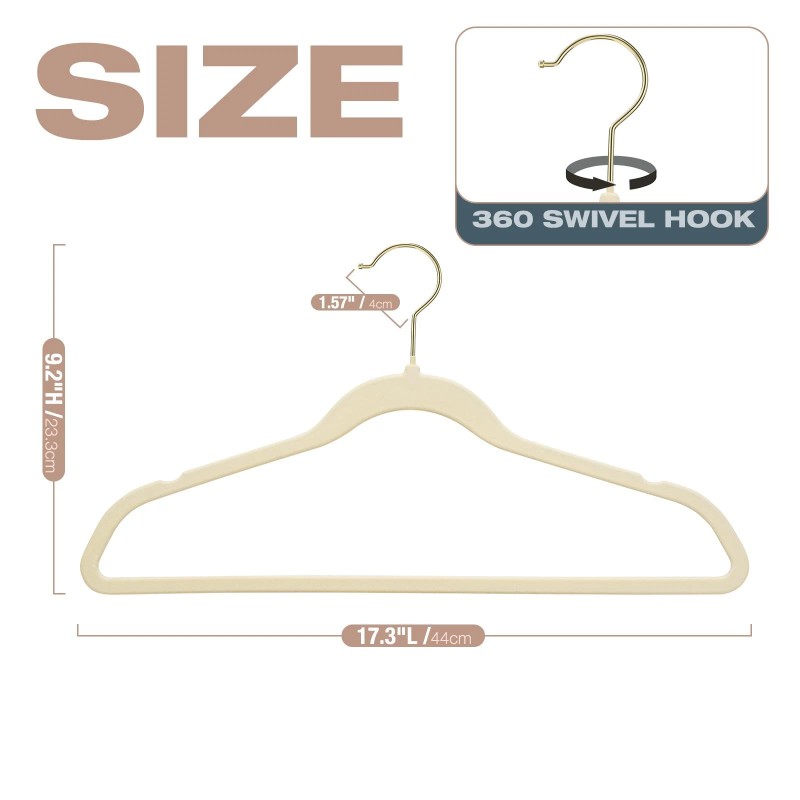 【Size】17.3"Lx 9.2"Hx 0.2"T,24-Pack,Beige,The 1.57" D of hook adapt of most closet rod.Velvet hangers with 0.2" thickness,slim,lighweight yet sturdy so they won't take up any extra room in the closet.Two in one.You can have your blouse and pants on one hanger,Without taking up as much space as traditional hangers!