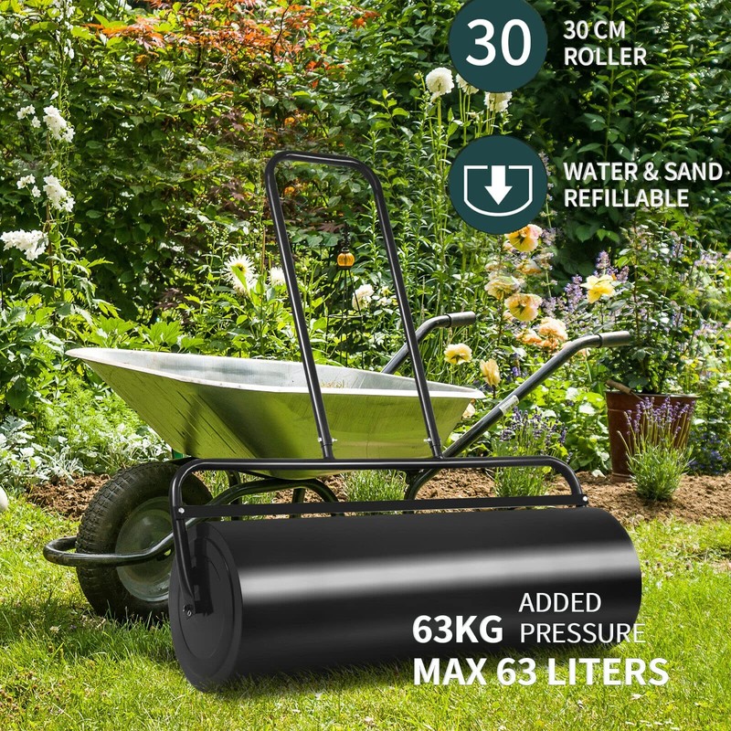 This lawn rolling machine makes planting and seeding a breeze.Powder-coated steel frame plus exquisite craftsmanship account for the reliable structure and promise longer service life. You can fill the drum with sand or water as needed to help you improve work efficiency. Designed with an ergonomic U-shaped handle, the lawn roller gives a convenient pull and push to you. Moreover, the sod roller is easy to store and transport due to its compact and lightweight design.Toward your dream lawn with this sod roller, do not hesitate to take it to your home!