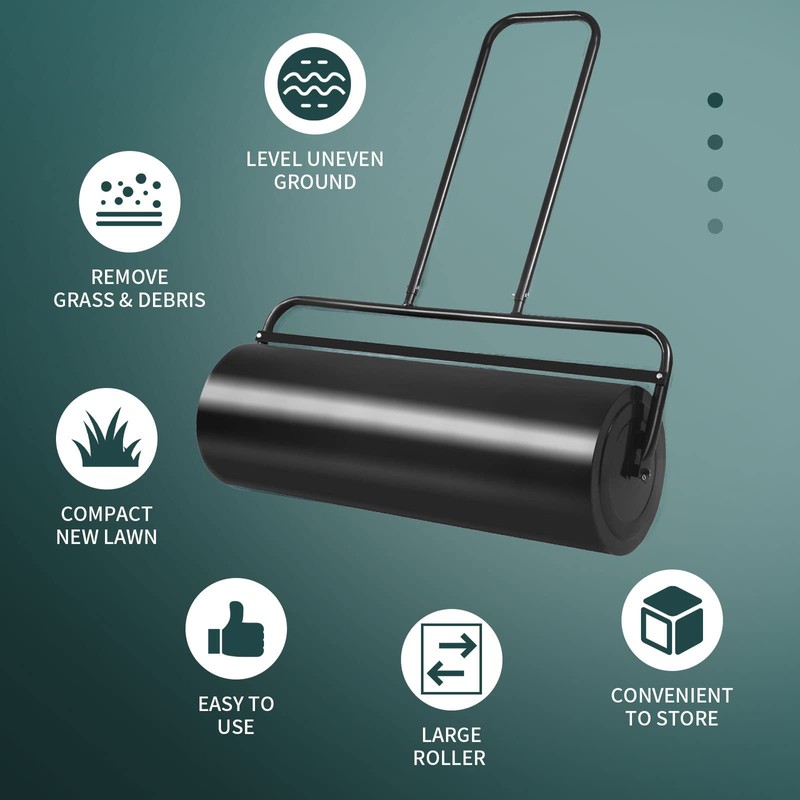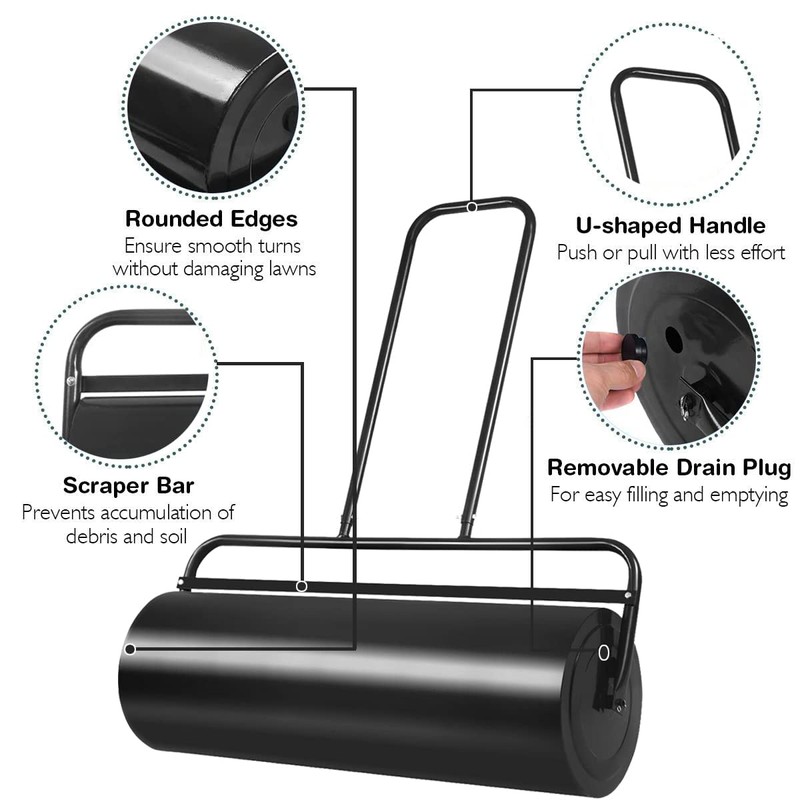 • Humanized Design: U-shaped handle can be comfortably pulled and pushed to use, compared with the traditional turf compactor, this body is simple to build, no power design, environmental protection, no pollution, no noise.What's more, the rounded drum edges help avoid damage to your lawn during turns.