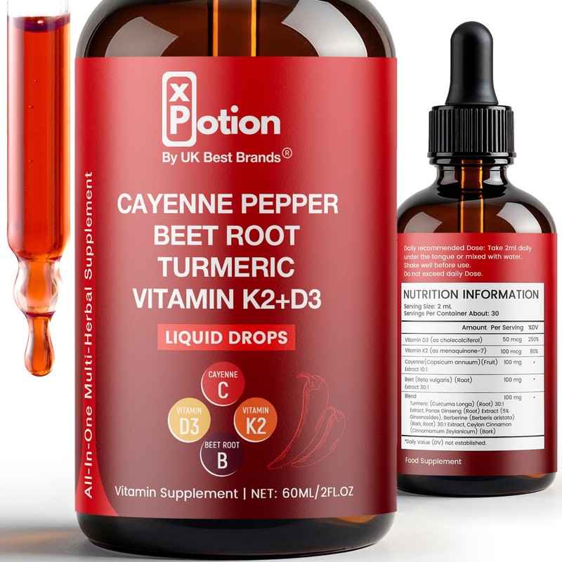 UK BEST BRANDS Cayenne Pepper Drops C XPotion - Natural Liquid Extract with Beet Root, Vitamin D3 & K2 C 60ml Herbal Supplement