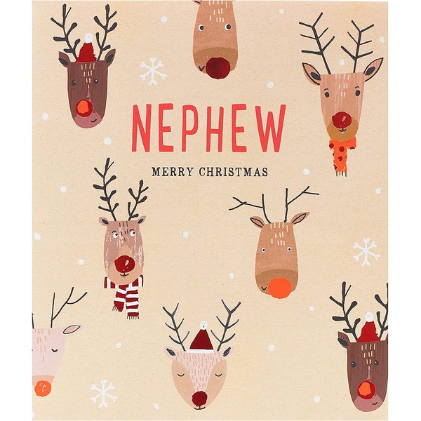 • 🎄 Wish your nephew a merry Christmas with this fun card, featuring reindeer faces with metallic red foil noses!
