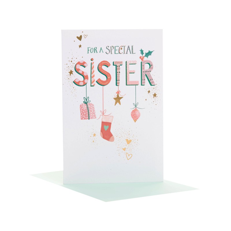 - Send Christmas wishes to a special sister with this colourful lettering card featuring hanging festive icons and gold foil detailing.
