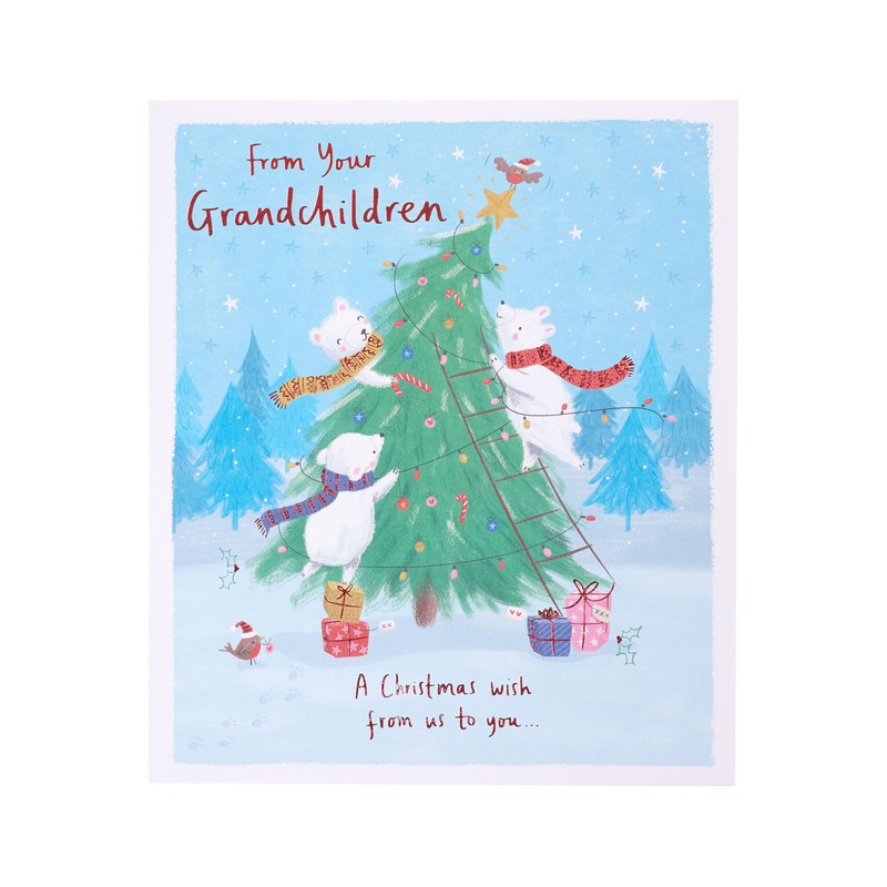 - Send a Christmas wish from the grandchildren with this cute card, featuring a playful polar bear and Christmas tree scene, finished with red foil elements.