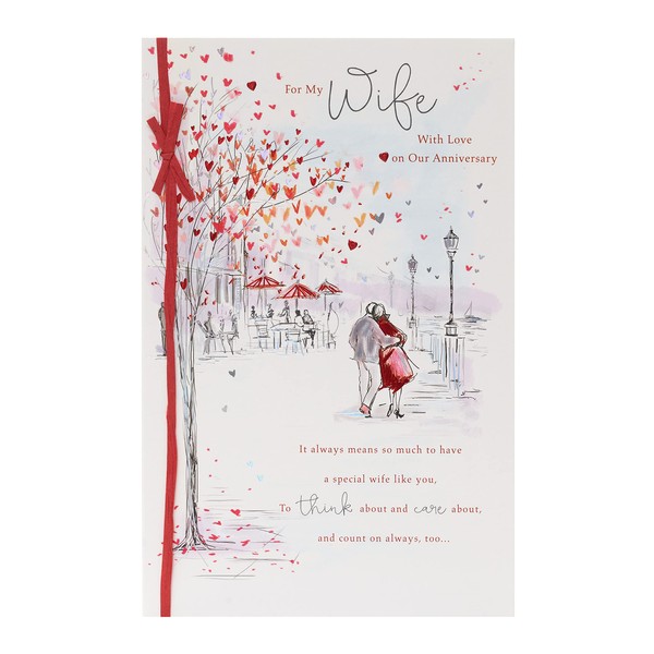 - Tell your wife that she means everything to you with this heartfelt anniversary card, featuring a romantic scene printed on premium quality board, with a red bow and red foil details.