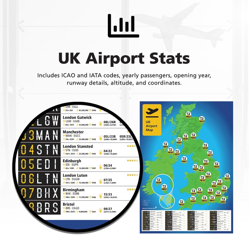- 📏Size: The poster is A1 (folded to A4) printed on 170 gsm paper, making it easy to see all the airports in the UK with their information clearer than ever.