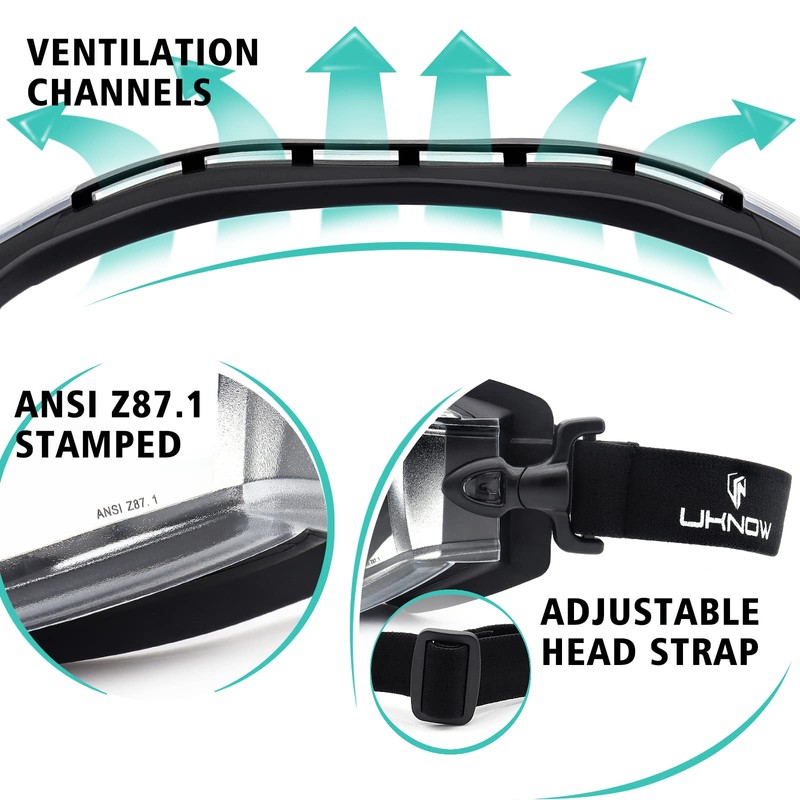 - 【Ultimate Comfort in Wear】UKNOW safety goggles prioritize your comfort with an adjustable strap that allows for a customized fit. Designed with ventilation ports, these goggles can promote airflow, reducing moisture and preventing fogging inside the goggles. This feature adds to the overall comfort and ensures a refreshing wearing experience.