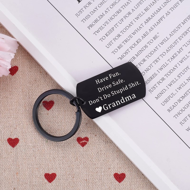 - Funny Reminder Keychains for Teenage Boy - This funny key chain engraved with humor message "Have Fun, Drive Safe, Don't Do Stupid Shit" from grandma. Perfect small gifts to remind your kids to do the right things and keep going in a fun way. Funny love gifts for grandson granddaughter from grandma, grandmother
