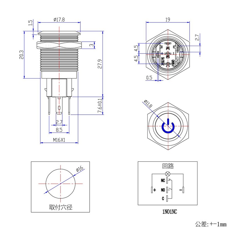 Also comes with blue LED ring lights. It is a single pole and double throw type, with 0.7 inch (19 mm) thread and 0.04 inch (1 mm) pitch.
