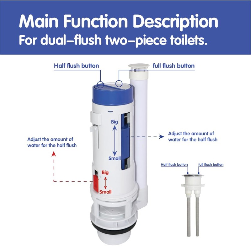 • Adjustable Water Volume:The flush valve allows you to adjust the water volume for both Full Flush and Half Flush modes, helping you manage water resources more efficiently. Detailed adjustment instructions can be found in the product images