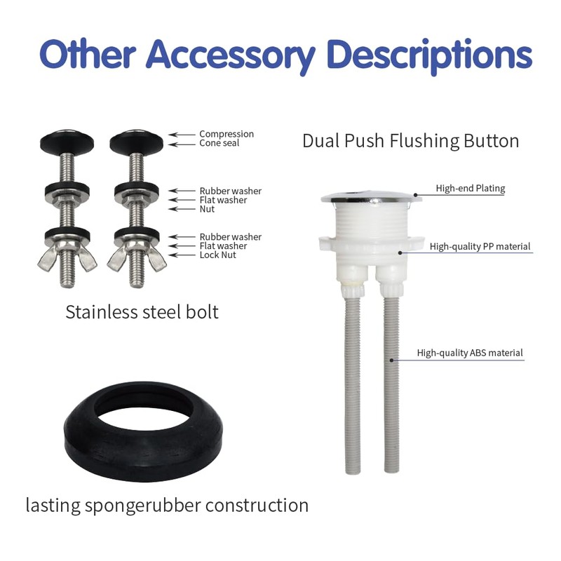 • Premium Materials:The flush valve and button are made from high-quality ABS materials, ensuring durability and performance under varying water pressures and conditions. Additionally, the kit includes a thick rubber seal to significantly reduce the chances of leaks