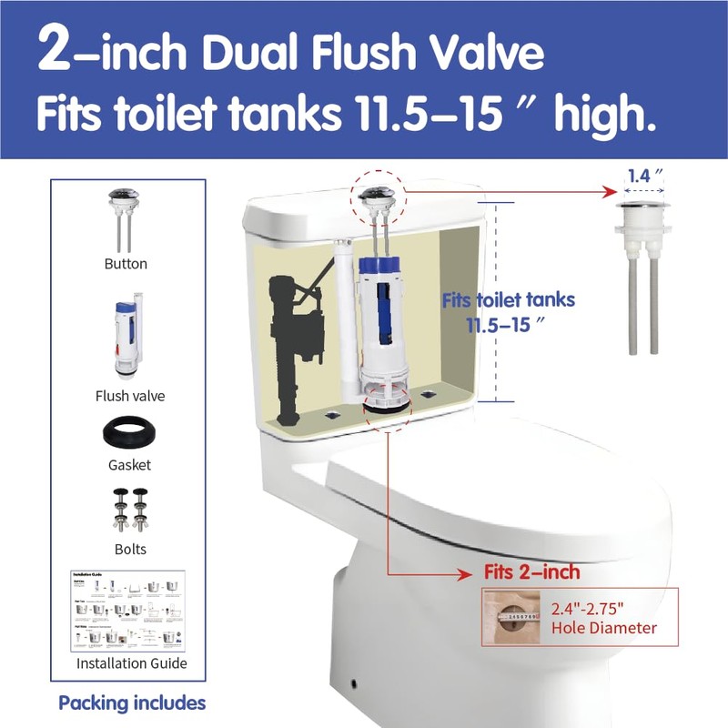 • Wide Compatibility:This dual flush valve kit is compatible with most 2-inch two-piece toilets. Before purchasing, please confirm your toilet's drain hole diameter is between 2.36 inches and 2.75 inches , tank height is between 11.5 inches and 15 inches , and tank lid hole diameter is between 1.5 inches and 1.77 inches. Compatible with brands like TOTO, Glacier Bay, Aqua Source, Project Source, Swiss, Deer Valley, Horow, Woodbridge, Fine Fixtures, WinZo, and more