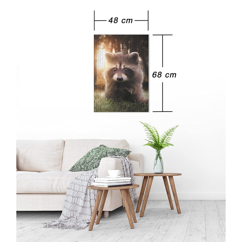 Ulmer Puzzleschmiede - Puzzle "Raccoon is looking for friend" - Loving animal motif as 1000 pieces puzzle - the cute little raccoon houses a butterfly and warm-hearted his paw
