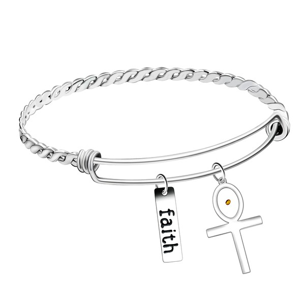 Uloveido 2.5 Inch Twisted Wire Bangle Bracelet with Faith Mustard Seed Charms Egyptian Ankh Cross Pendant Y1175 (Oval Cross)