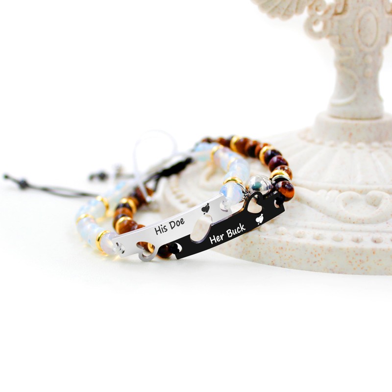 Uloveido 2 Pcs Adjustable Tiger Eye and Opal Beaded Bracelet, His Doe and He Buck Stainless Steel Couple Bracelet, Commemorative Gift, Valentine's Day Gift Y4080(doe buck