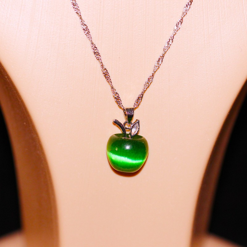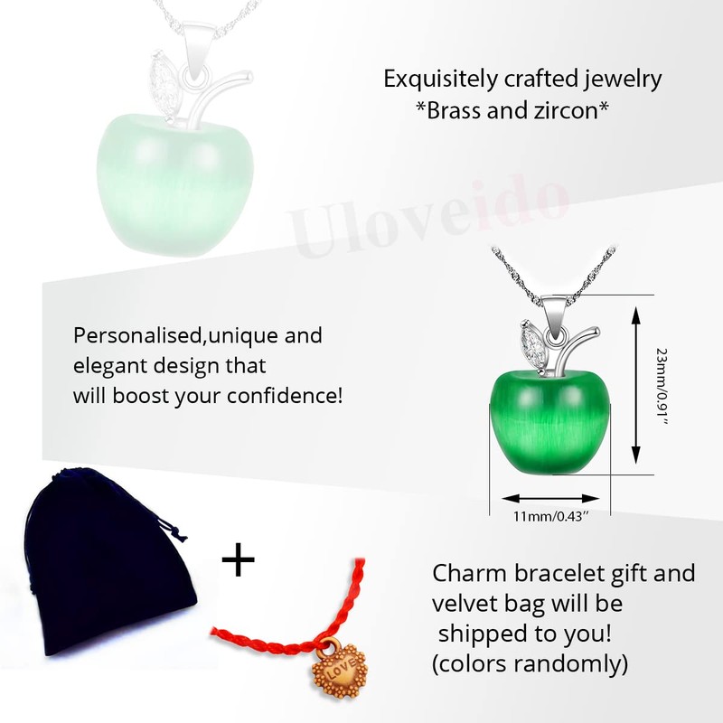 Uloveido Teacher's Apple Necklace White Gold Plated, Lab Moonstone CZ Stone Necklace, Apple Pendant Necklace Gift For Women Teacher (Dark Green) YL007-N