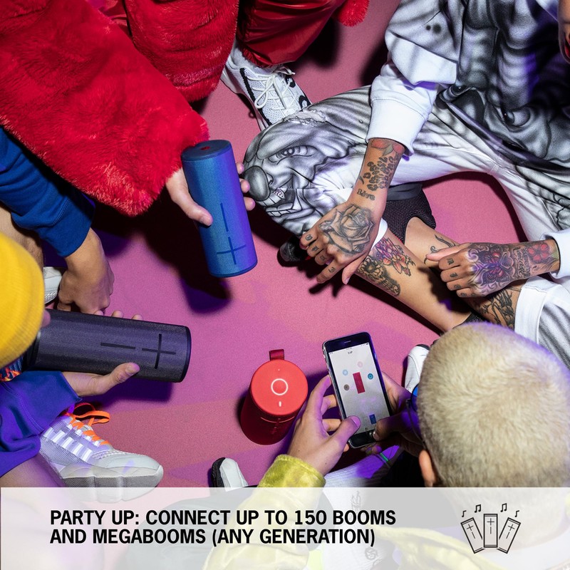 - PARTY UP: Use PartyUp on the Ultimate Ears app to pair 2, 3, 4...and over 150 speakers for the ultimate sound experience. You can pair any generation of BOOM and MEGABOOM together.