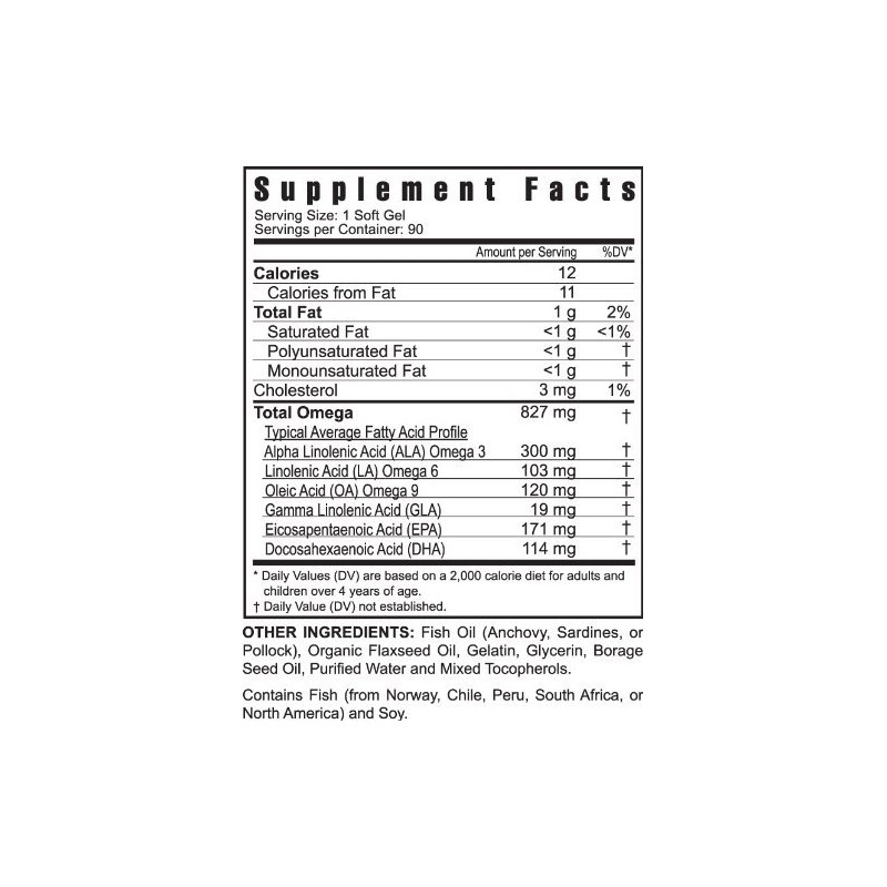 - Contains a proprietary blend of fish oil, flax seed oil, and borage seed oil.