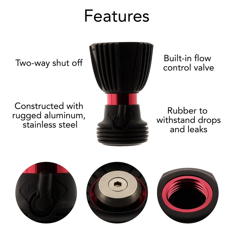 - Heavy Duty & Built to Last - turn any standard garden hose into a multifunctional spray tool with this hose sprayer nozzle. Featuring a two-way shut off, built-in flow control valve, and constructed with rugged aluminum, stainless steel, and rubber to withstand drops and leaks