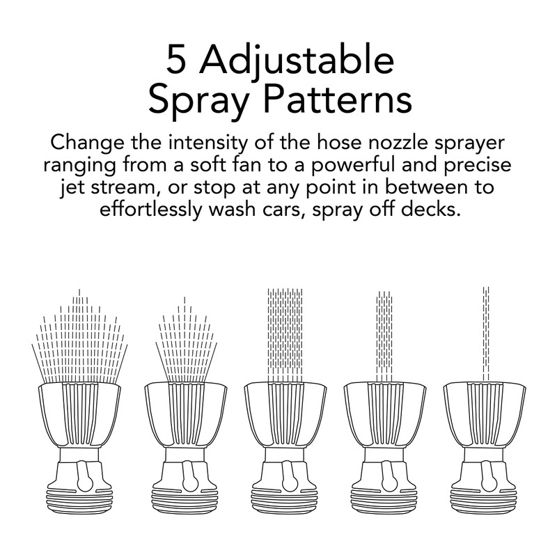 - 5 Adjustable Spray Patterns - change the intensity of the hose nozzle sprayer ranging from a soft fan to a powerful and precise jet stream, or stop at any point in between to effortlessly wash cars, spray off decks or just water your garden