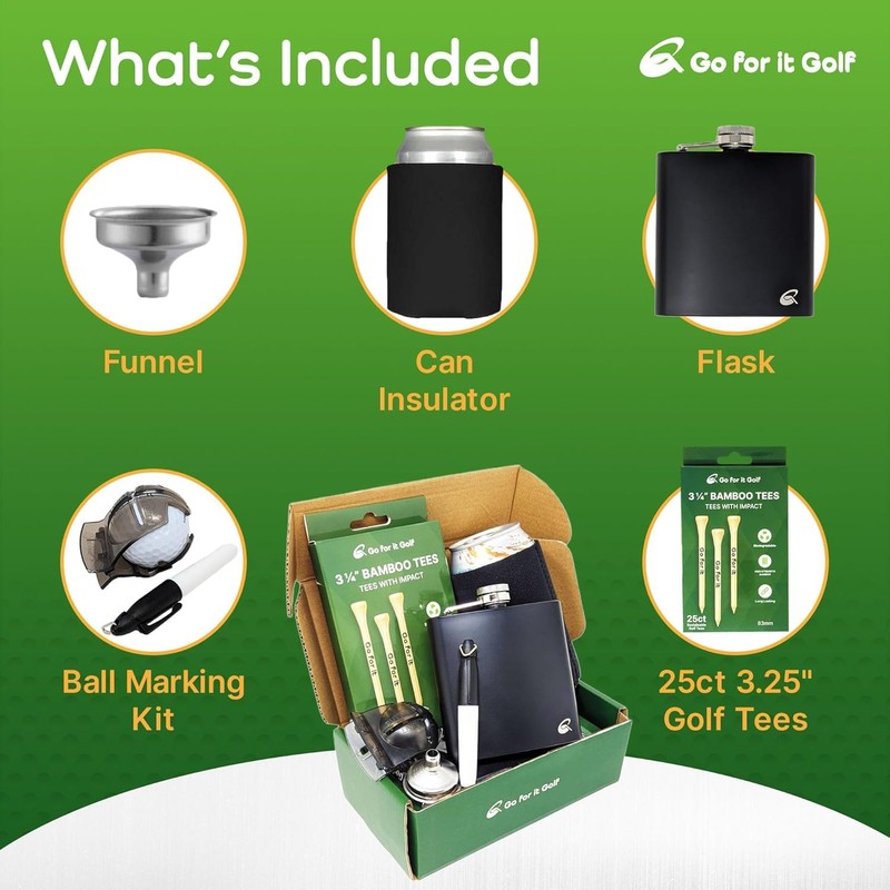 - All-in-One Golf Gift Set. Premium stainless steel flask, durable golf tees, professional ball marking kit, insulated can cooler, perfect golf accessories bundle for the course essential golf kit for men who love to play