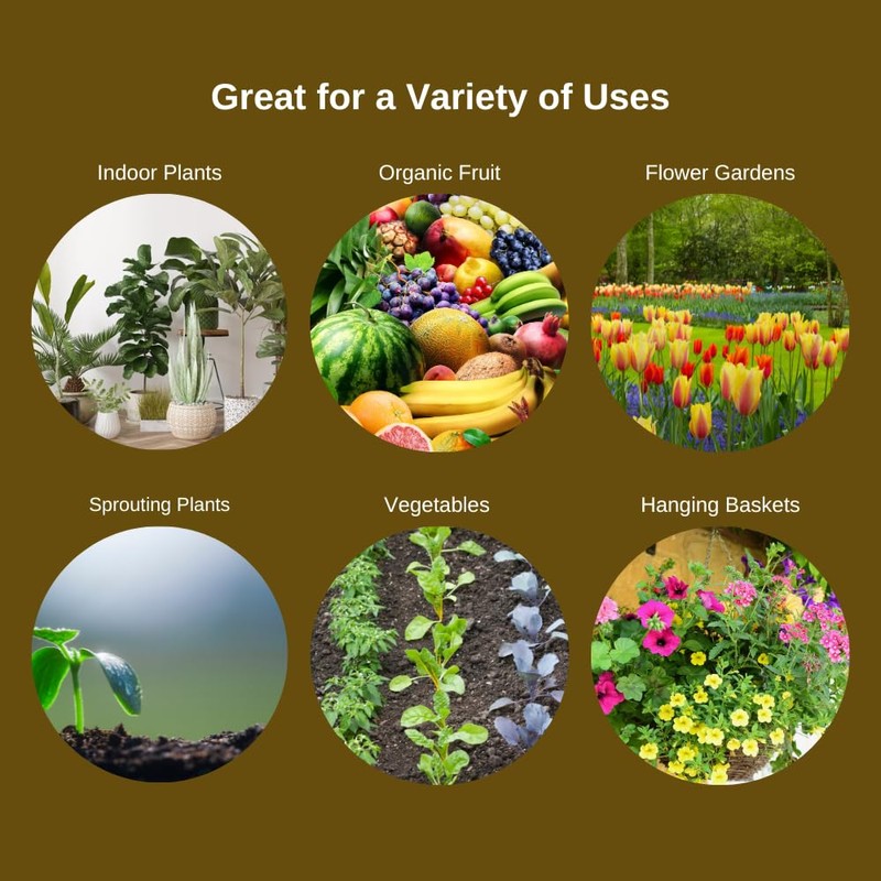 - Use for bedding/flowering plants, hanging baskets, foliage/cuttings, seed germination, containers, vegetables, tropical plants, or shrubs