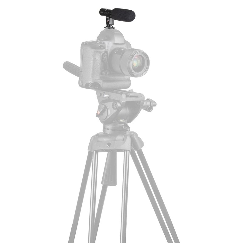 – Compatible with DSLR cameras and video cameras. – Uni-directional electret condensor microphone. – Ability to record directly in stereo. – Hot/ cold shoe mount with locking knob. – Built in cable with 3.5mm stereo mini plug. – Foam wind screen included. – Includes aluminum hot shoe bracket. – 1 year limited warranty. – Professional Broadcast Quality Audio While Recording videos.– Directional pattern: Unidirectional. – 90° or 120° range width pickup pattern. – Frequency range: 30Hz – 20,000Hz. – Sensitivity: -40dB (0dB = 1V/Pa at 1 KHZ). – Signal to noise ratio: 76dB (1 KHZ at 1 PA). – Output impedance: 200 Ω. – Weight: 45 g (not including battery). – Power requirement: (1) 3V CR2 lithium battery (included). – Battery life: approximately 800 hours at room temperature.