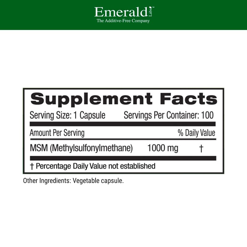 Ultra Botanicals Emerald Labs MSM 1000 mg - Dietary Supplement with Plant-Sourced Methylsulfonylmethane for Joint Support and Healthy Immune Function - 100 Vegetable Capsules