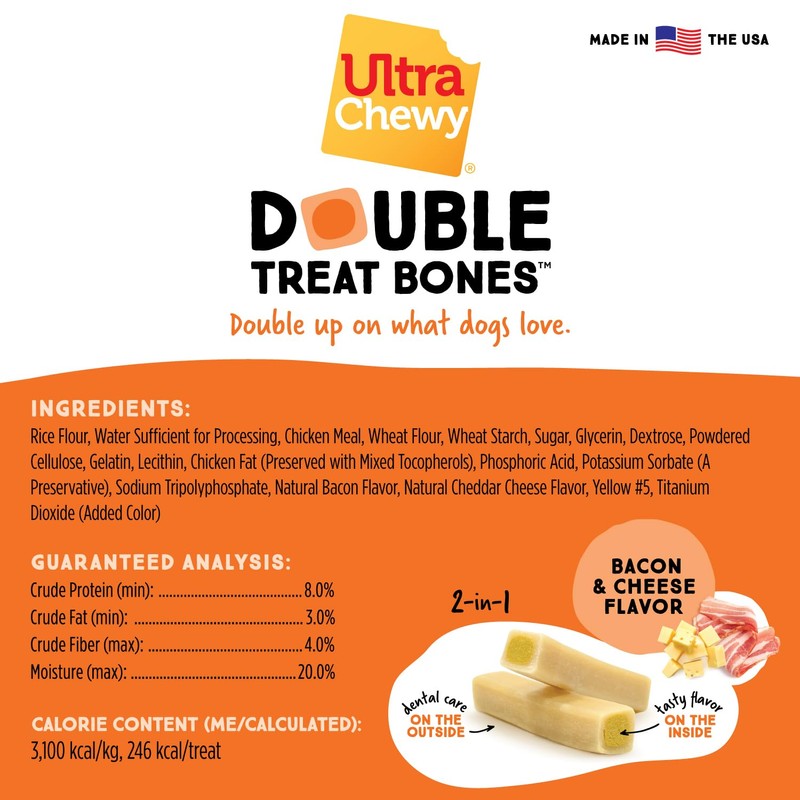 Ultra Chewy Bacon and Cheese Double Treat Bones: Long-Lasting Chews Made in USA, Highly Digestible, for Aggressive Chewers (Bacon and Cheese, 6 Count)