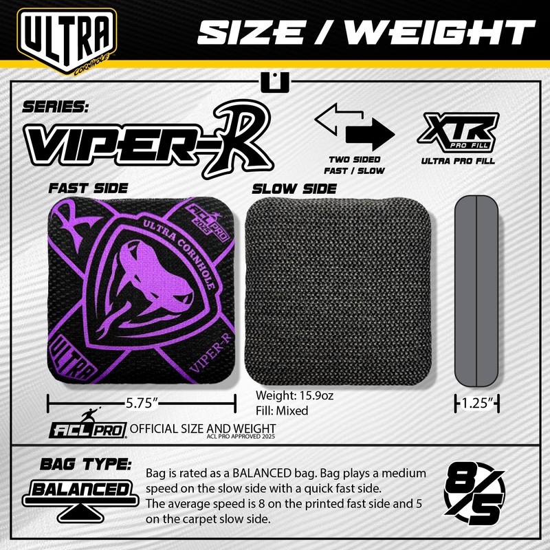 - Two different fabrics: Ultra Cornhole's Viper-R bags utilize two unique fabrics to optimize game play. The fast side is made for speed and durability. The hybrid-carpet slow side is perfect for cutting and rolling bags.